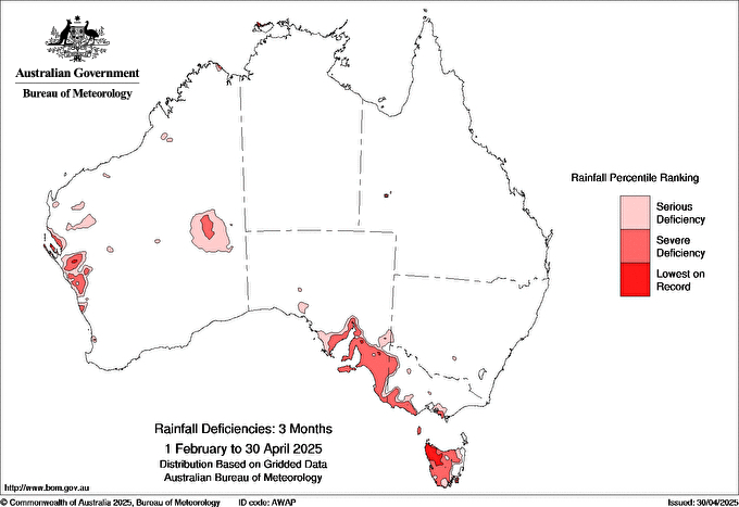 This has exacerbated the drought with an area in Severe Deficiency to Lowest on Record stretching across southern South Australia, southwestern Victoria and much of Tasmania.