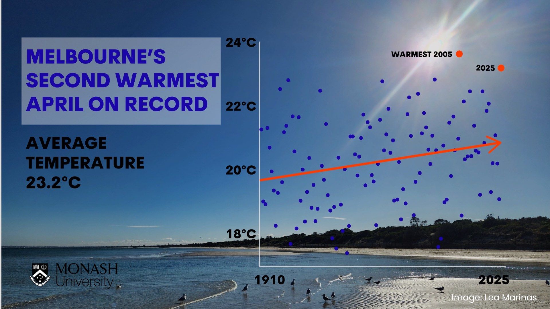Nearby, both Melbourne Airport and Moorabbin are having their warmest April on record, but these stations don't have the history that the city does, both going back half a century.